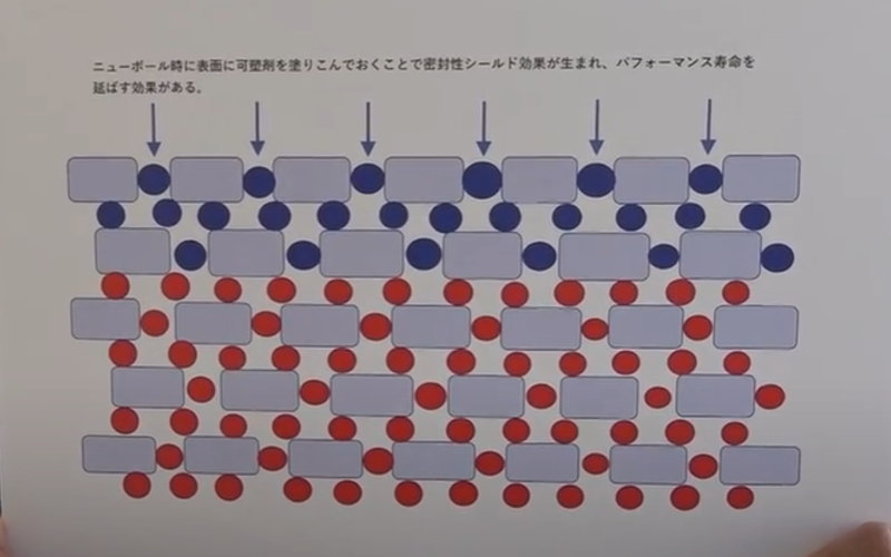 可塑剤は表面に薄く塗布するような加工をしてるので 箱出しのまま使うのがベスト ボールメンテナンスは投球前後のクリーニングと 50G程度でオイル抜きし 研磨は2000番アブラロンで手でささっと撫でる程度良いと言ってました つまり 表面に薄く塗布さてる加工を剥がしてしまうと 性能が落ちてしまうと言っておりました (ちなみにSプロ的にはって話しです) 僕はメーカーの資料やセミナーでも そんな話しを聞いたこともないので そもそもリアクティブウレタンのケミカル系カバーは 製造時に可塑剤を添加し硬化後可塑剤が昇華して出来た微細な多孔質な表面にして 投球毎にオイルを内部に浸透蓄積させ、オイル吸着(吸収)によりオイル上でも 摩擦を生み出しキャッチや切れを増幅させるというものです オイルを吸着(吸収)し続けるとカバーストックの孔がオイルで飽和し 本来の摩擦力やピンアクションが低下するのでオイル抜きをしましょうね~と推奨されてます。 研磨についてですがカバーストックの表層部の凹凸がレーンとの接触で 劣化したりオイルと汚れで微細孔が詰まり固着するので 定期的に研磨しフレッシュな層を表面に出さないとダメだと考えております。 フレッシュな層には昇華していない可塑剤がありますので オイル抜きと同時に少しだけ可塑剤を昇華させます、 すると昇華した部分に新しい微細孔が生まれオイルの吸着(吸収)性能が回復します ロゴやシリアルナンバーが消えるまでは研磨できますのでドンドン研磨した方が得策かと 定期的な手での研磨だと数ミクロンしか削れないので300回くらいは研磨できると思います。 (キズ取り研磨だと数回までかと思いますが・・・) と コメントしました 返信はもちろんなし ※タレコミで教えていただいたのですが 僕のコメントだけ見えないらしく 非表示にされてるような気がします Sプロ発信するのは良いのだけども ソースを出してほしい 個人的っていうのではなくて S社のセミナーで言ってたとか H社の資料があるとか ということで その動画の日から情報収集をしてたら Sプロの言ってる情報はみつからなかったんですが すごく有益な内容の栗本プロのプログと動画を見つけました 栗本プロのアメブロと動画です その1 https://ameblo.jp/probowlingkurip/entry-12910744148.html その2 https://ameblo.jp/probowlingkurip/entry-12910967802.html 動画 また時間をつくってSプロの件を調査します○┓ 〆 |