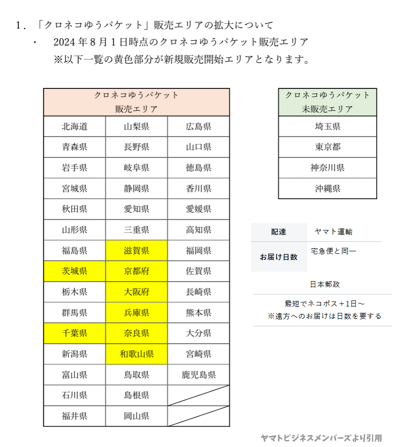 クロネコゆうパケットの販売エリアが増えるとのこと 簡単に言うと ヤマトが集荷して配達は日本郵便が行うというサービス 2023年6月のブロブでも告知しましたが ほぼクロネコゆうパケットになりましたね https://ballmaintenance.no-mania.com/Entry/250/ 8月から奈良県もクロネコゆうパケットでの出荷となります 送料は変わりませんが、到着までの日数が ネコポスと比べプラス数日かかるようになりそうです (遠くなるほどお届けに日数がプラスされます) また、クロネコメンバーズの投函完了メールは非対応となり 到着のときのメールがなくなります ご不便をおかけし申し訳ありませんが、何卒ご理解の程よろしくお願いいたします お知らせPDF https://business.kuronekoyamato.co.jp/service/lineup/kuroneko_yu_ packet/pdf/salesarea_kuroneko_yu_packet.pdf ヤマト運輸のサービス内容 https://business.kuronekoyamato.co.jp/service/lineup/kuroneko_yu_ packet/index.html ※追記※ 2024年7月30日 「ネコポス」復活? 今日集荷の時に頂いたお知らせなんですが ここを見ると 2024年10月1日より 「ネコポス」を再販売をしますとのこと つまりですね 白のエリアでは以前から 日本郵便による配送でしたが、人件費、システム変更 お届けに時間がかかるなど色んなことがネックなんでしょうね ですので 黄色のエリアでは、8月・9月は 日本郵便による配送になるけども 10月からは以前のように 全国でヤマト運輸の「ネコポス」に戻しますとのことです ま~ 大人の事情なんでしょうね… 朝日新聞社 マイベストプロ https://mbp-japan.com/nara/jkotera/column/5166964/ Yahooショッピングのコンビニ支払い手数料変更のお知らせ 2024年9月1日 ご注文分より ■対象 Yahooショッピング