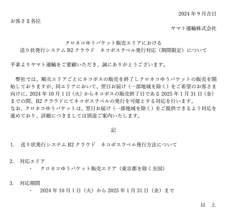 https://ballmaintenance.no-mania.com/Entry/292/ 2024年10月1日現在 東京都以外はクロネコゆうパケットでの発送となりましたが クロネコゆうパケットになったは良いのですが 郵便局を経由するのでお届けまでにプラス1日以上かかるので ネコポスを再販売するとのことです 2025年1月31日までとなっていますが クロネコゆうパケットを、翌日お届け(一部地域を除く)で ご提供できるよう対応を進めてはいるが出来ない場合は ネコポスを継続販売するのではないか?と想像してます という訳ですので、2025年1月31日まで 翌日お届け(一部地域を除く)のネコポスで発送手配をさせて頂きます ※ネコポスでも クロネコゆうパケットでも 発送可能です。 (クロネコゆうパケットをご希望のお客様はお知らせくださいませ) 朝日新聞 マイベストプロ 小寺淳一氏コラム https://mbp-japan.com/nara/jkotera/column/5175057/ 〆 |