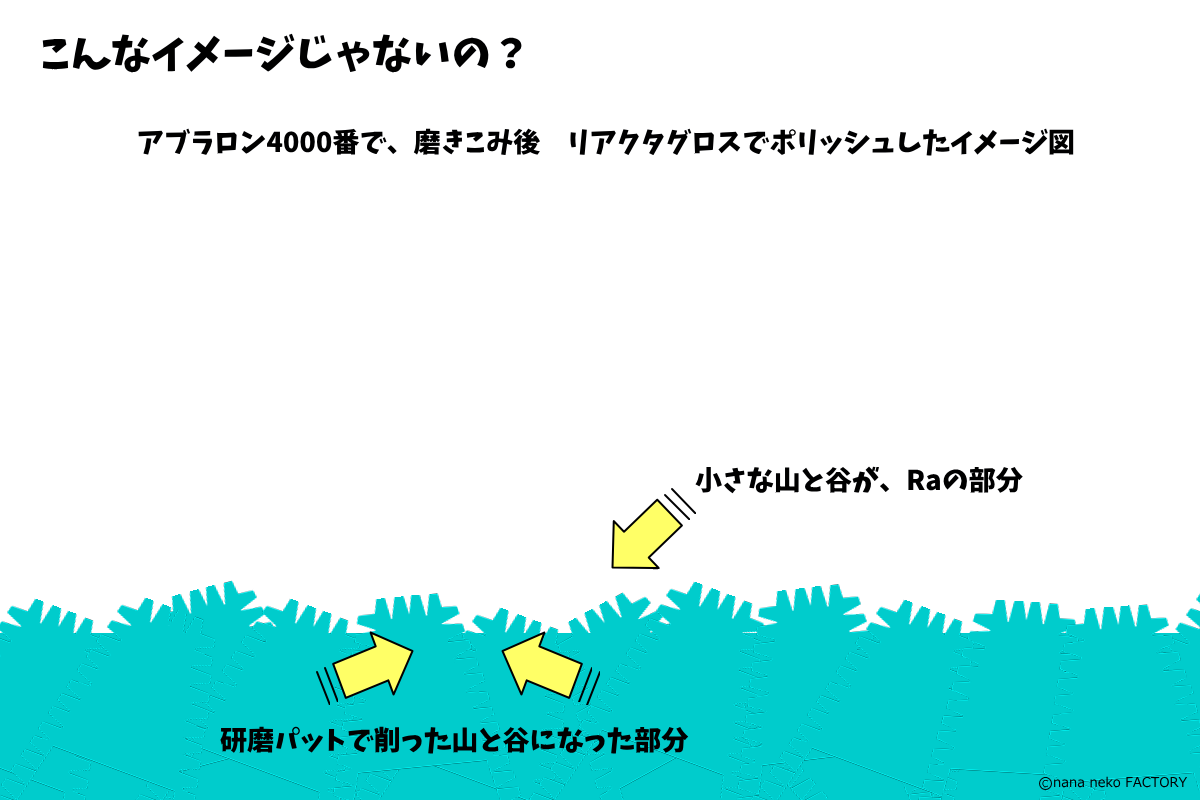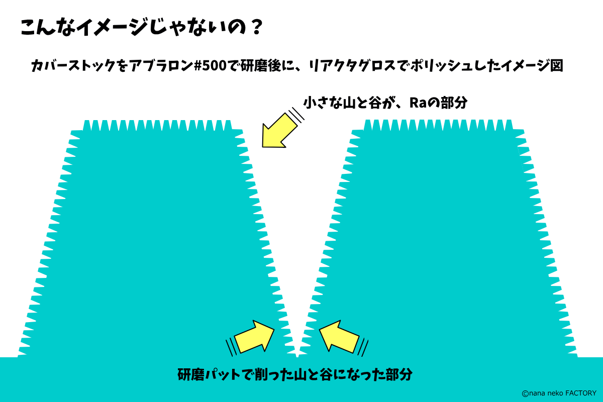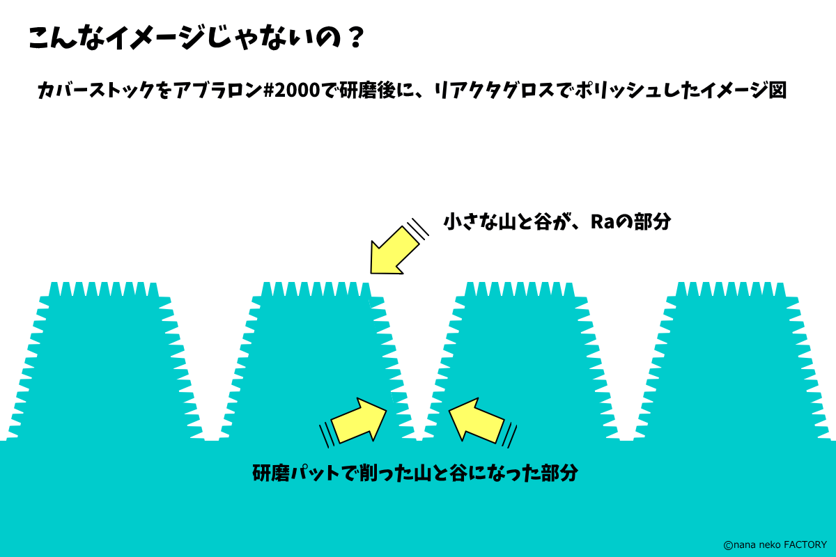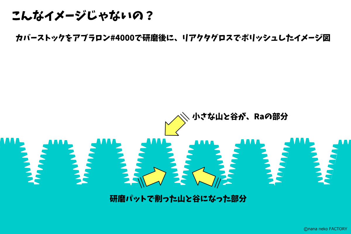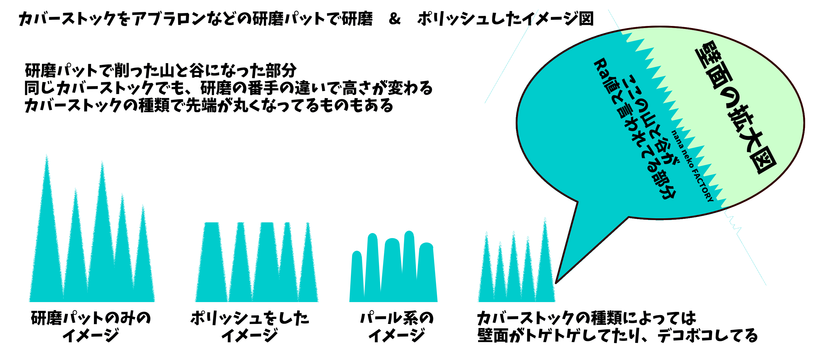 カバーストック表面のイメージ図が出てたんです 下記は 僕の頭の中のイメージ図なんですが・・・ もっと突っ込んでいくと カバーストックをアブラロン#500で研磨後に、 リアクタグロスでポリッシュしたイメージ図 500の目を残して光沢を出すって こんなイメージじゃないのかな?? ステップ2(拡散コンパウンド)でポリッシュしても 先日の動画で、1500番以上にならないと言ってたので 上記の画像より、大きな山と谷が低いくらいで 近いものになるんじゃないかな・・・ カバーストックをアブラロン#2000で研磨後に、 リアクタグロスでポリッシュしたイメージ図 カバーストックをアブラロン#4000で研磨後に、 リアクタグロスでポリッシュしたイメージ図 アブラロン4000で磨きこみ後 リアクタグロスで研磨したイメージ図 先日の動画のリンク① https://www.youtube.com/watch?v=KRA47JlYUlU 先日の動画のリンク② https://www.youtube.com/watch?v=DQltSUifeaU 実際 こんな綺麗に山と谷があるわけじゃないし あくまでもイメージってことを理解してほしい Raの構造も 持って生まれたものだから ここは後から変えることはできないし トゲトゲもレーンとの接触でどんどん 砕けては、新しいのが出てきて どんどん 入れ替わりしてゆきます 下記は 以前 STORMさんが公開してた カバーストックのイメージ図 こちらは エボナイトさん こちらは、新しく作り直した 僕が製作したイメージ図 動画内で言ってたことをまとめました R2 R3 R4 の違いは山の高さ