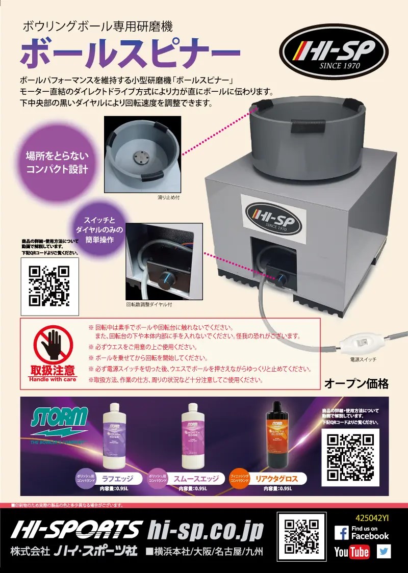 以下動画の内容を簡単にまとめたもの ボウリング場さま向けのボールスピナーを 小型化したタイプを数量限定で販売します 非常に小型でコンパクトにできておりまして モーター直結のダイレクトドライブです (通常は減速プーリとVベルトドライブ) モーターの軸に直で土台を回転させます スイッチを入れて前面パネルのつまみで回転数の制御が可能です 回転数を調整できるということは 過去のスピナーでは搭載されてなく 一定の回転数で研磨を行うのが一般的でした ダイレクトドライブ方式のため ものすごく速い回転数にも設定できます 回転数が制御できるということは色んな使い方だできる 高速回転にして、ポリッシャーとしてコンパウンドで光沢を出す 中速回転にして、研磨スピナーとしてカバーストックを再生をさせる (自分の使いやすい回転数で良いと思います) 使い方 ボールを回転台に乗せます スイッチを入れます つまみを回して使用目的に合わせて回転数を調整する 例えば箱だし仕上げに戻すような仕上げの場合は 中速回転にしてアブラロン500番を1面で10秒程度 スイッチを切って回転数が落ちてきたらアブラロンをクルクルさせて 色んな方向の目を入れる その後、気持ち速めでコンパウンドでポリッシュします (使いやすい速度に調整してポリッシュしてください) 注意 止める時は手で止めるのではなくウエスなどで抑えて止めること ≪補足≫ 1面磨いたら 180度ひっくり返して 下の面を研磨 90度 横向けて 研磨 180度ひっくり返して 研磨 合計 4面を研磨するとOKです 研磨方法などは下記をご覧ください。 https://ballmaintenance.nomaki.jp/RaRsRpRvRy.html レーンのオイル量やどこを投げるかなどで劣化具合や速度は変わりますが 新品のボールで40~50ゲームでRaの先端が折れたり山が削れて Rsの幅が変化し100ゲームでほどんどなくなります 山が削れてしまうと 谷の部分(赤い部分)にオイルが吸着できなくて ボールパフォーマンスが低下し 動きは一定になるのですがレーンの影響を受けやすくなります 再生という形で言ったら リアクタグロス仕上げ #2000 → リアクタグロス #500 → #2000 → リアクタグロス #360 → #500 → #2000 → リアクタグロス 1500グリットポリッシュ仕上げ #1000 → ポリッシュ #500 → #1000 → ポリッシュ #360 → #500 → #1000 → ポリッシュ 2000グリット仕上げ #2000 #500 → #2000 #360 → #500 → #2000 何ゲームも投げる大切なボールですので 再生機能ということであれば 手でやるよりスピナーでやる方が よりボールの寿命が長くなると思います 繰り返し何度でも研磨して再生可能ですので まだやったことがないという方はどんどんトライして やってほしいと思います 今回のこのボールスピナー従来のものと比べて 利便性が高く小型でコンパクトです 販売は2024年8月頭を予定してます ※販売価格は分かり次第追記します とても素晴らしいことだと思います 自分のボールを自分でメンテナンスする時代にまた近づいた♪ ありがとう ハイスポーツさん 2024.9.5 追記 https://hi-sp.co.jp/product/ballspinner/ ※2025.8.1 ハイスポーツのサイトからページが消えて得るので アーカイブ貼っておきます アーカイブ ボウリングボール専用研磨機 ボールパフォーマンスを維持する小型研磨機 「ボールスピナー」 モーター直結のダイレクトドライブ方式により 力が直にボールに伝わります。 下中央部の黒いダイヤルにより回転速度を調整できます。 ● 場所をとらないコンパクト設計 ● スイッチとダイヤルのみの簡単操作 ※ 回転中は素手でボールや回転台に触れないでください。 また、回転台の下や本体内部に手を入れないでください。 怪我の恐れがございます。 ※ 必ずウエスをご用意の上ご使用ください。 ※ ボールを乗せてから回転を開始してください。 ※ 必ず電源スイッチを切った後、 ウエスでボールを押さえながらゆっくりと止めてください。 ※取扱方法、作業の仕方、周りの状況など十分注意してご使用ください。 オープン価格 〆 1年しないで取扱い終了か... |