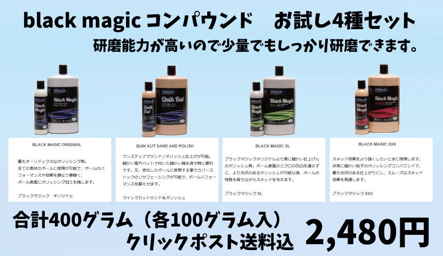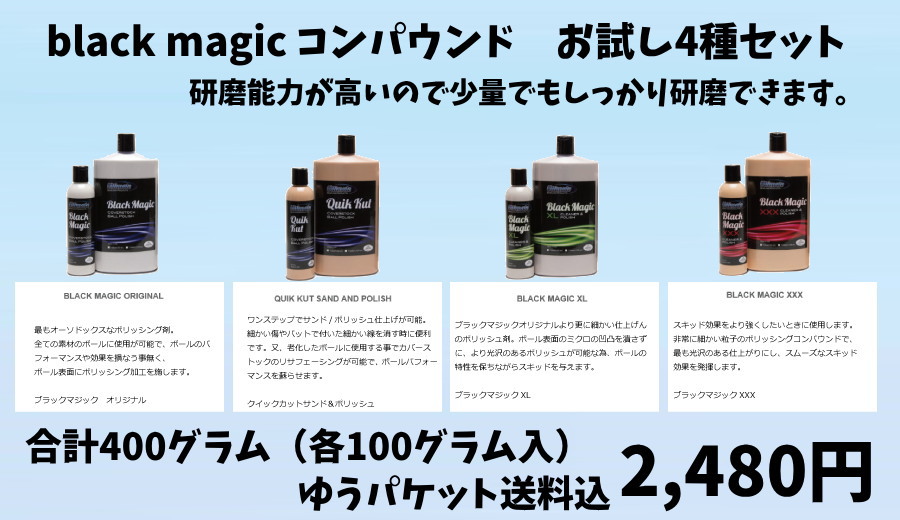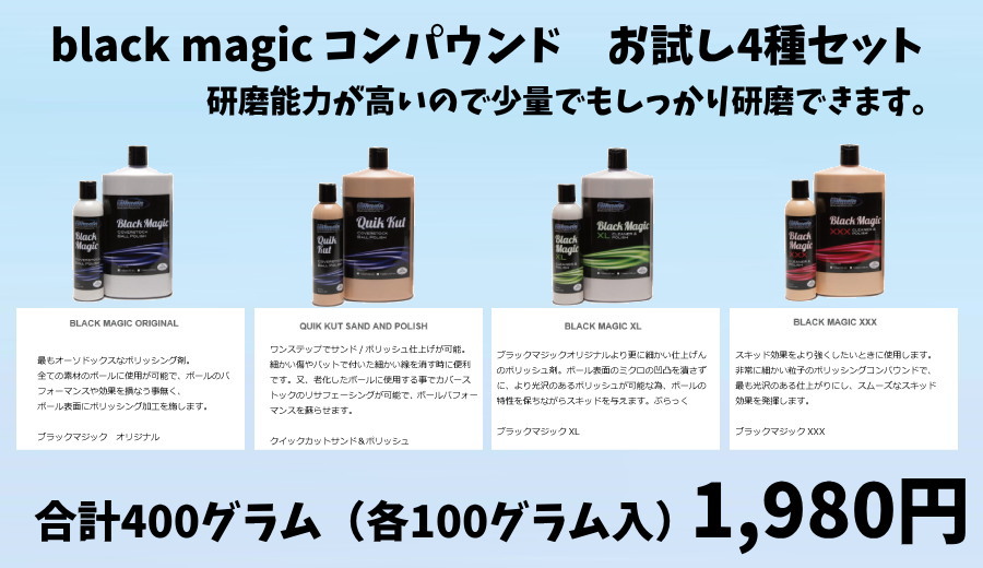 お試し4種セットを作りました 業務用のコンパウンドですので 研磨能力が高いので少量でも しっかり研磨できるのが特徴です 各100グラム(合計400グラム)で ゆうパケット 又は クリックポスト 送料込 2,480円 使いやすく保管に便利なスパウトパウチに入れてお届けになります。 4面研磨で約12グラム程度使用しますので 400グラムでボール30個ほど磨けると思います。 公式サイトのコンパウンドのリンク ↓ ↓ http://www.ultimatebowling.com/product-category/cleaners-polishes/ 非常に細かい粒子のポリッシングコンパウンドで、