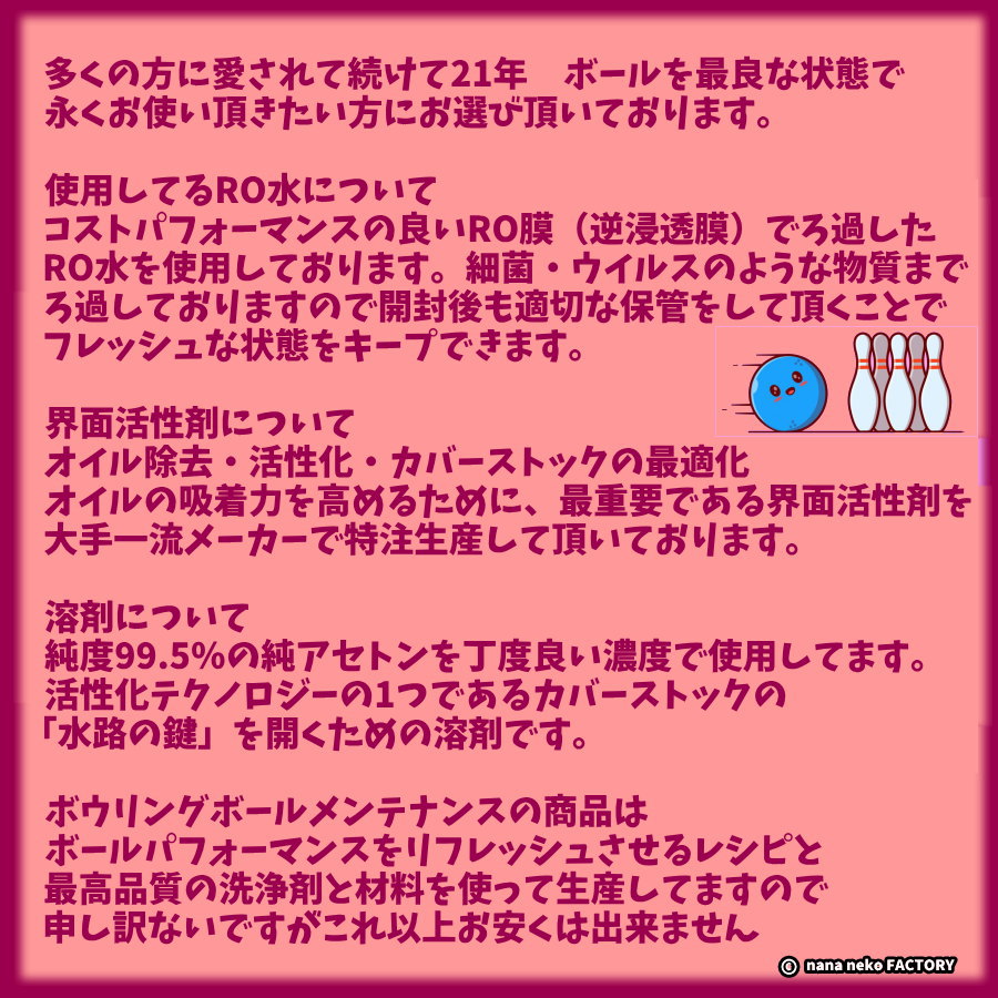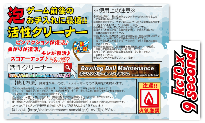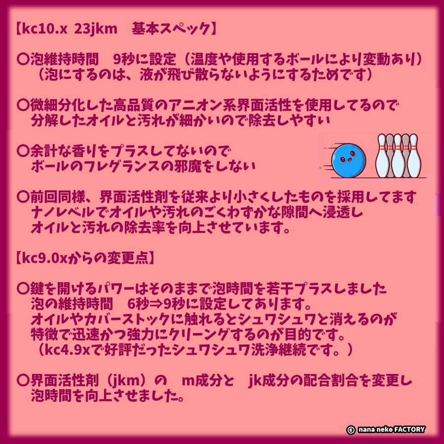 βテストの結果 どうも・・・ kc9.0Xの方が人気があるようで リリースしなくても良いとの声が多いです kc9.0Xは、kc4.9xの後継だけあって 完成されてるのかも知れませんね… 2024年5月1日より Yahooショッピングで一定期間 トライアルテスト販売を行います 500cc 777円 2000cc 2,222円 ここから購入できます。 ※追記 2024年5月5日 ヤフオク用に下記の画像を作りました Tさん監修なのですごく可愛くて良い出来です♪ 使用してる水について僕の見解 ある程度まで、ろ過された水なら 僕は問題ないと思ってます 不純物が残ってるから 洗浄効果が激減するとは僕は思いません 仮に水道水でもボールを洗浄するには必要十分だとも思います だからこそ、水より洗浄剤にコストをかけてます 何が必要で 何が不要なのか オイルを除去すること 活性化させること カバーストックの最適化をすること オイルの吸着力を高めること これこそが最重要だと思ってます しっかりオイルを落として しかりカバーストックの水路を洗って しっかりすすぎ すみずみまでクリーンにする これこそがボールパフォーマンスを リフレッシュするためには必要な事です 水は、ある程度まで、ろ過された水なら そこまでこだわる必要はないと思う 水はそのままでは、洗浄力が低い 今流行のマイクロバブル・マイクロナノバブル これは、器具の先っちょから空気を取り込んで ちょ~~~小さい 空気の泡を混ぜることで 洗浄効果を高めたり、色んな効果が生まれるようです (詳しくは、ググってください) 高圧にしてジェット噴射したら 水圧で汚れを蹴散らせれる ケルヒャーみたいなやつです ※追記 ここまで※ ++以下過去の記事のリンク++ kc10.xx アルファテスト その1 https://ballmaintenance.no-mania.com/Entry/225 kc10.xx アルファテスト その2 https://ballmaintenance.no-mania.com/Entry/230 kc10.x βテストも兼ねた先行販売 https://ballmaintenance.no-mania.com/Entry/231/ kc10.x βテスト開始 https://ballmaintenance.no-mania.com/Entry/232/ ++ここまで++ 一定期間が過ぎたら 製品版をリリースさせて頂きます。 〆 |