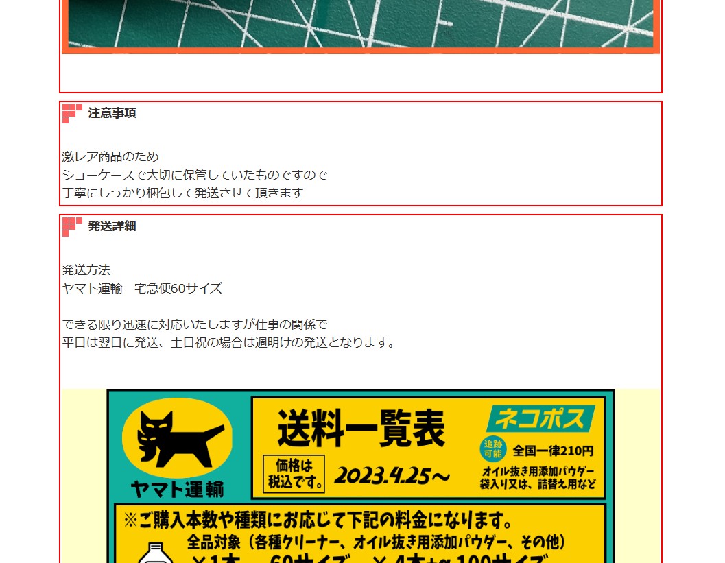 ○Yahooオークションアプリ ○サファリ ○パソコン この3つで 良い感じになるような レイアウトを探してます とりあえず よくなるレイアウトは見つけたものの Yahooオークションアプリの 画像が小さくなる問題がうまくいかない 他の人(以下PKさん)のソースをみると 3つで画像が大きく見えるし (900pxの画像が3つでちゃんと表示されてる) ヤフオク公式のサポートを見ると 商品説明欄の横幅は最大920pxとなってる どうして僕のだけダメなのかを 調査したいと思う 実際に出品しないと 見れないですごく困る アプリでのこれで良いですか? プレビュー表示これですって言うのが出ない Yahooオークションのソース見ると ソースが内部変換されてて 独自のソースになってるんだよね しかも1行で2000文字くらいある すごく見にくい。。。 これを脳内でコンパイルして解読するという。。。 なんとか解読して 横幅 90%可変 画像サイズ指定なしというのは分かった PKさんが使ってる @即売くん https://www.noncky.net/ 即売くんで作ってみました テスト用にショーケースから 『投げるな はらちゃん』を使い作ってみました 0824 横幅 60%可変 画像サイズ 900px固定 Yahooオークションアプリ サファリから パソコンから これは・・・ Yahooオークションアプリと パソコンからは・・・同じような感じに見える サファリだけ・・・ 画像サイズがおかしい 枠も表示されない・・・ え。。。 なんで。。。 次回90%にしてみよう 0825 横幅 90%可変 画像サイズ 900px固定 Yahooオークションアプリ サファリから パソコンから 画面幅90% 画像900pxで スマホだと良い感じだとは思う パソコンからだと文字が小さく感じるけども 大きくすると スマホで大きすぎて読みずらい 次回800px固定にしてみよう 0826 横幅 800px固定 画像サイズ 800px固定 Yahooオークションアプリ サファリから パソコンから Yahooオークションアプリ 画像小さいな… 次回は画像を100%可変にしてみよう 0827 横幅 800px固定 画像サイズ 100%可変 Yahooオークションアプリ 画像小さいな… サファリから パソコンから 多分だけども 0825 横幅 90%可変 画像サイズ 900px固定 これが1番ましか・・・ 少し考えよう とりあえず もう1回 横幅90%可変 画像サイズ900px固定で出してチェックしよう 文字が折り返すかもチェック 0828 Yahooオークションアプリ サファリから パソコンから 良い感じだね 文字もちゃんと折り返してる 〆 |