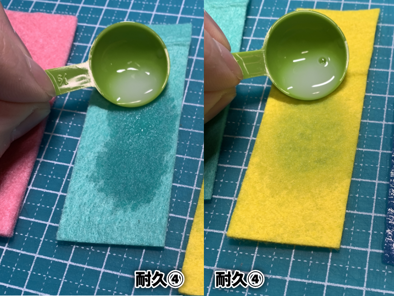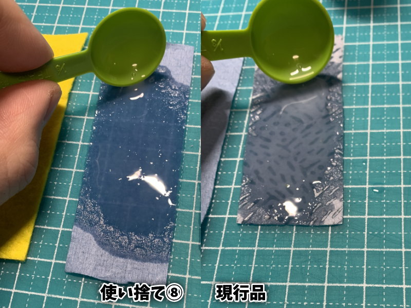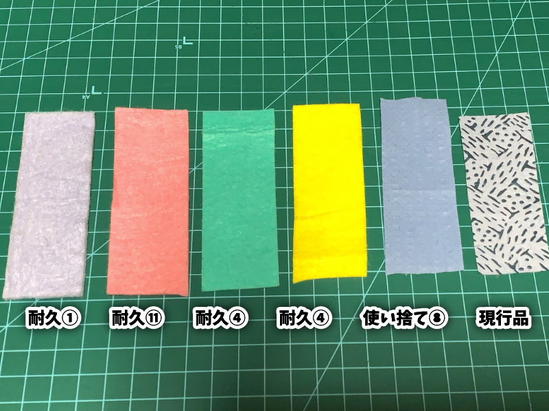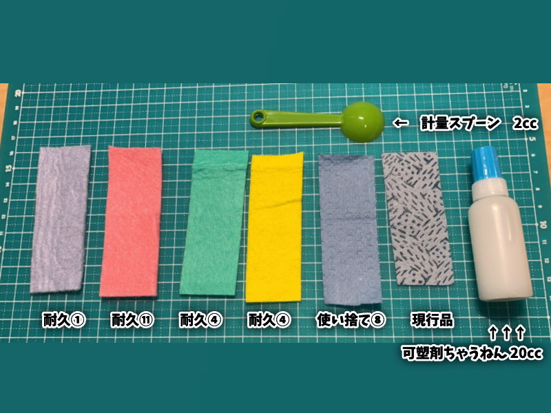 選考用に 下記の6種類で調査したいと思います 現行品(現行品) クレシア キムタオルタオルブルー 耐久性のあるものの考察①(耐久①) 下記は、2012年にオイルカット君をリリースした時に この吸水マイクロファイバーにオイルカット君を スプレーしてボール拭き拭きしてね~ってセット販売してた物です 厚みは約3ミリでフェルトみたいな感じの見た目です 耐久性のあるものの考察④(耐久④) 多機能ファイバークロス 素材は、ビスコース (光沢のあるレーヨン素材) 厚み 約1.2ミリ 耐久性のあるものの考察⑪(耐久⑪) 吸水クロス 1P 素材 レーヨン、ポリエステル 厚みは、約2.5ミリ 耐久①とよく似た感じに見えます 厚みは、若干レッドの方が薄い感じ 使い捨てのもの考察⑧(使い捨て⑧) セラーズ SELLARS 工業用ワイプ TOOLBOX T700 耐溶剤で特厚 ブルー 素材 ポリプロピレン繊維とセルロース 厚み 約0.7ミリ すべて良いサイズカットします (100ミリ × 100ミリ 程度でカット) それをさらにカットして並べます 30ミリ × 85ミリ くらい 吸水試験を行います 用意したもの 計量スプーン 2cc 可塑剤ちゃうねん 20cc 計量スプーンに、可塑剤ちゃうねん を 2cc入れます 順番に、2ccずつ 染み込ませます 染み込ませた状態 良い感じに染み込んでいます いいね イイね 良いよ~ 下があまり濡れてないので シートに、吸われてる感じですね これは、吸いすぎてダメですね・・・ 2ccでは、全く足りない感じです 続きまして 洗濯試験 お水の中で 3分くらい もみもみ ぎゅ~っと絞ります 並べて乾燥させます~ 実用範囲の乾燥にかかった時間 室温22℃ 湿度63% 現行品 クレシア キムタオルタオルブルー 2時間程度 使い捨て⑧ セラーズ SELLARS 工業用ワイプ 2時間程度 耐久④ 多機能ファイバークロス 8時間程度 耐久⑪ 吸水クロス 1P 12時間程度 耐久① 吸水マイクロファイバー 12時間程度 カッターマットに並べて乾燥ではなく 空中に、ぶら下げて干すと もう少し早くなると思います。 24時間乾燥後 乾燥後は 伸縮することなく元の厚みまで戻ってます 現行品 クレシア キムタオルタオルブルー 使い捨て⑧ セラーズ SELLARS 工業用ワイプ 耐久④ 多機能ファイバークロス 耐久⑪ 吸水クロス 1P 耐久① 吸水マイクロファイバー まとめ ちゃうねんのリリース時から思ってる事ですが 小さく薄いと塗りにくいけど 吸水がちょうどいい 分厚いく大きいと塗りやすいが ちゃうねんの吸水が多いから、2ccでは足りない これって トレードオフの関係だと思うんだよね 小さいのも ペラペラなのも、 シートに必要以上に吸水されると ボールに塗布できないからであり 使いやすさを求めるならば 分厚く、吸水の多い、 吸水マイクロファイバーが良いね 可塑剤注入が趣味・大好き・仕事だという人は ヨコヨコ容器 ペン型容器など を 購入して頂くことが良いと思う ↓ ↓ ↓ https://ballmaintenance.no-mania.com/Entry/186/ 通常のユーザーさんには、 セラーズ SELLARS 工業用ワイプ TOOLBOX T700 耐溶剤で特厚 ブルーを フリーサイズで採用したいと思います。 詳細が決まりましたら 追記します ○┓ 順次 HP、ショップのページなどの 準備が出来ましたら切り替えさせて頂きます 〆可塑剤ちゃうねん 塗布用シート考察 |