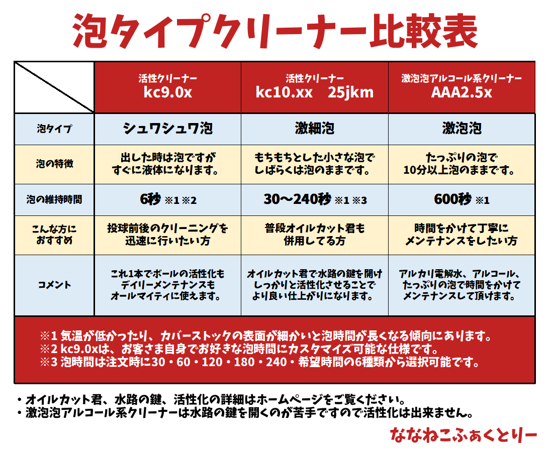 ホームページへの詳細は後日追記します ○┓ 泡時間が30秒・60秒・120秒・180秒・240秒の5種類 泡時間が希望時間の1種類 合計6種類から選択して頂けます 泡時間は設定時間となりますので 気温、使用ボールのカバーストック、オイル吸着度合い 表面粗さ、表面仕上げの関係で 実際に泡が消える時間とは異なります 販売金額はKC9と同じにします 25JKMは少し手間がかかりますが ファンの皆様の笑顔のために頑張ります♪ Yahooショッピング 販売ページ 2025年2月24日より1部の商品のみ先行販売してます 4月初旬よりフルラインナップで販売させていただきます (3月11日準備が出来ましたので販売スタートしました) 3種セット https://store.shopping.yahoo.co.jp/7neko/trial3.html 500cc https://store.shopping.yahoo.co.jp/7neko/kc10-500.html 2リットル https://store.shopping.yahoo.co.jp/7neko/kc10-2.html お好きなクリーナー全種 https://store.shopping.yahoo.co.jp/7neko/18bcfec7af.html 23年24年に頂いた23JKMのフィードバックをまとめたもの KC10.x 23JKMになって、泡時間が数秒伸びたがKC9.0xとの違いが解りずらい 泡時間が、10秒程度なのでしばらく置いておくことができなく すぐ拭かないと液が垂れてしまう パワフルで、オイルと汚れがしっかり落ちますが オイルカット君も併用してるのでもう少しマイルドな方が使いやすい 溶剤のニオイをもう少し減らしてほしいです 手荒れなどの心配がなく使いやすいです 泡泡に、カスタマイズしたら丁度良くなりました オイルカット君を前後で吹きかけると、さらにキュキュ感が向上します オイルカット君を活性クリーナーの前後で使う方が増えてきまして 足し算じゃなく掛け算になり相乗効果がかなり出ているようです 今回KC9.0x(泡時間6秒)との差別化のため 泡時間を大幅に伸ばしたモデルを併売することにしました 水路の鍵を開くオイルカット君OC1.47 オールマイティなKC9.0x 激細泡でマイルドなKC10.xx 25JKM 【KC10.xx 25JKM 基本スペック】 〇泡維持時間 30~240秒に設定(温度や使用するボールにより変動あり) (泡時間のカスタマイズも可能ですので注文時に指定して頂けます) 〇微細分化した高品質のアニオン系界面活性を使用してるので 分解したオイルと汚れが細かいので除去しやすい 〇余計な香りをプラスしてないのでボールのフレグランスの邪魔をしない 〇前回同様、界面活性剤を従来より小さくしたものを採用してます ナノレベルでオイルや汚れのごくわずかな隙間へ浸透し オイルと汚れの除去率を向上させています。 【KC10.x 23JKMからの変更点】 〇鍵を開けるパワーも持ちつつ泡時間を大幅にプラスしました 泡の維持時間 9秒⇒180秒に設定してあります。 オイルやカバーストックに触れても泡が消えないのが特徴で 激細泡をしっかりボールに馴染ませ丁寧にクリーングするのが目的です。 (お客さまのクリーニングスタイルに合わせて泡時間をカスタマイズ可能) 〇界面活性剤(jkm)の m成分と jk成分の配合割合を変更し 泡時間を向上させました。 〇クリーニングの物足りなさを感じないようにもちもちな激細泡にしてます 〇オイルカット君との併用時の洗浄バランスが良くなるように調整しました <<プロセス>> 活性クリーナー バージョン10 25年モデル ラッキーストライク量産クリーナーを作ろう コイン100で★をどれだけ集めれるかチャレンジ中♪ 〆 |