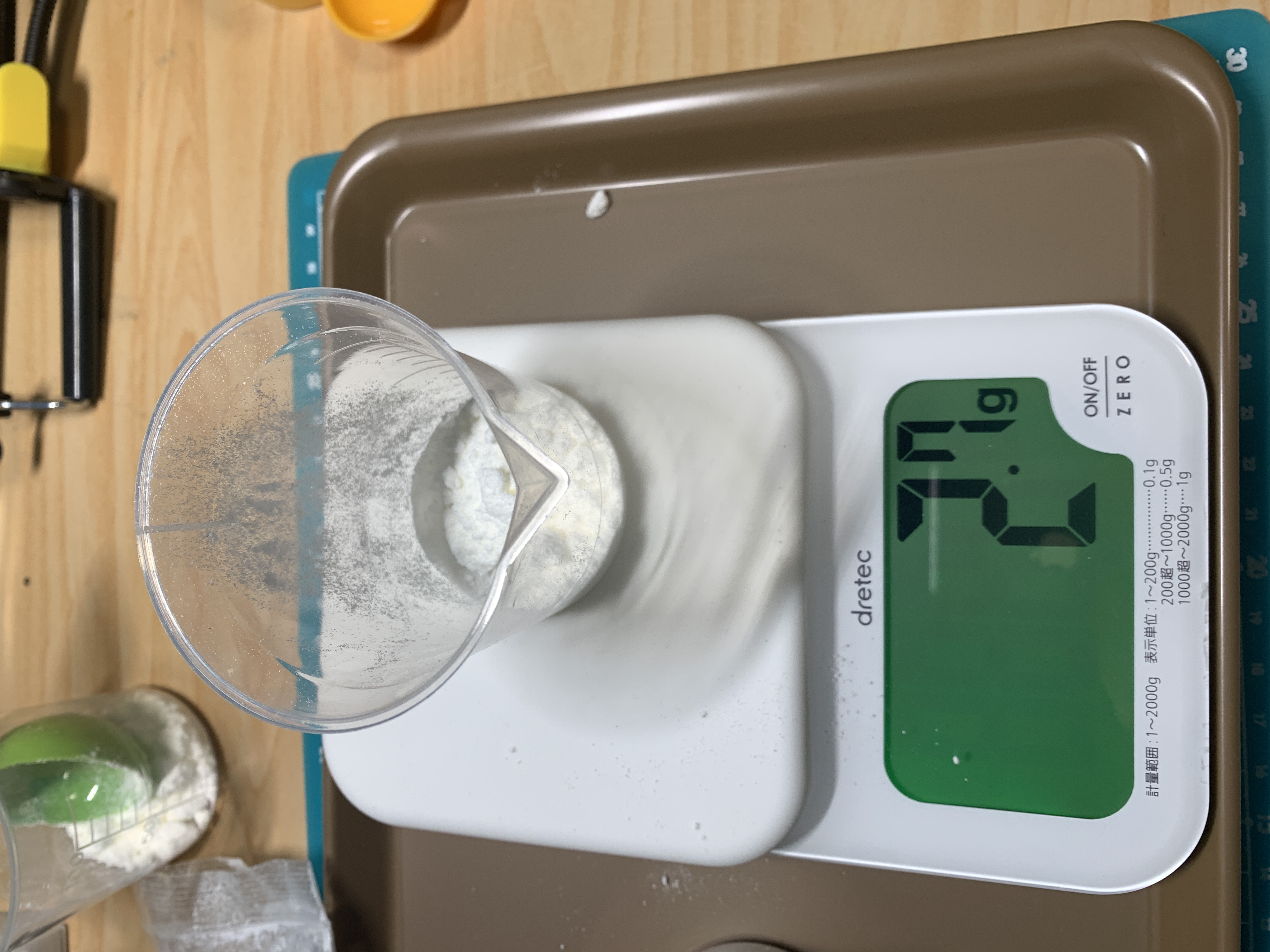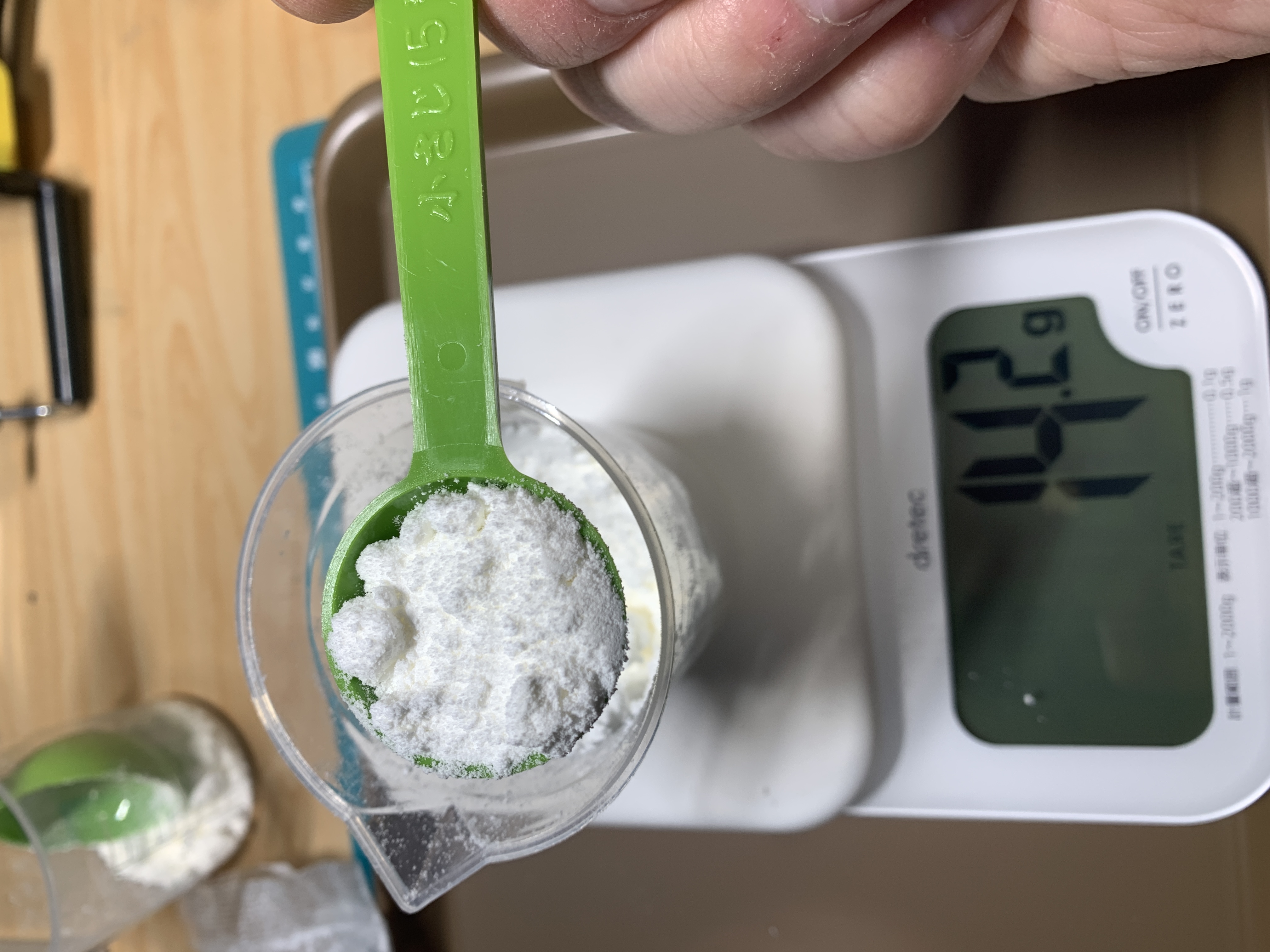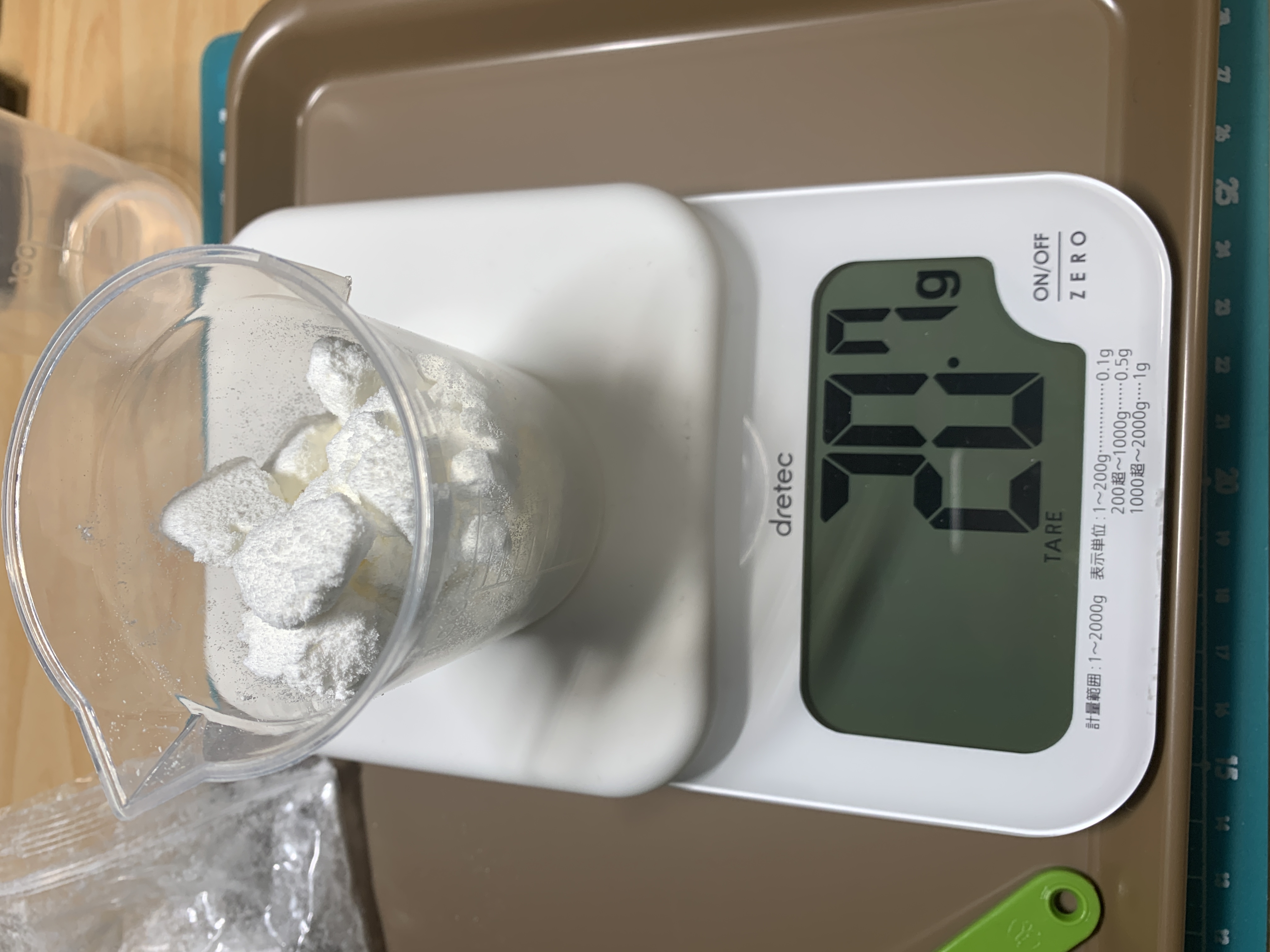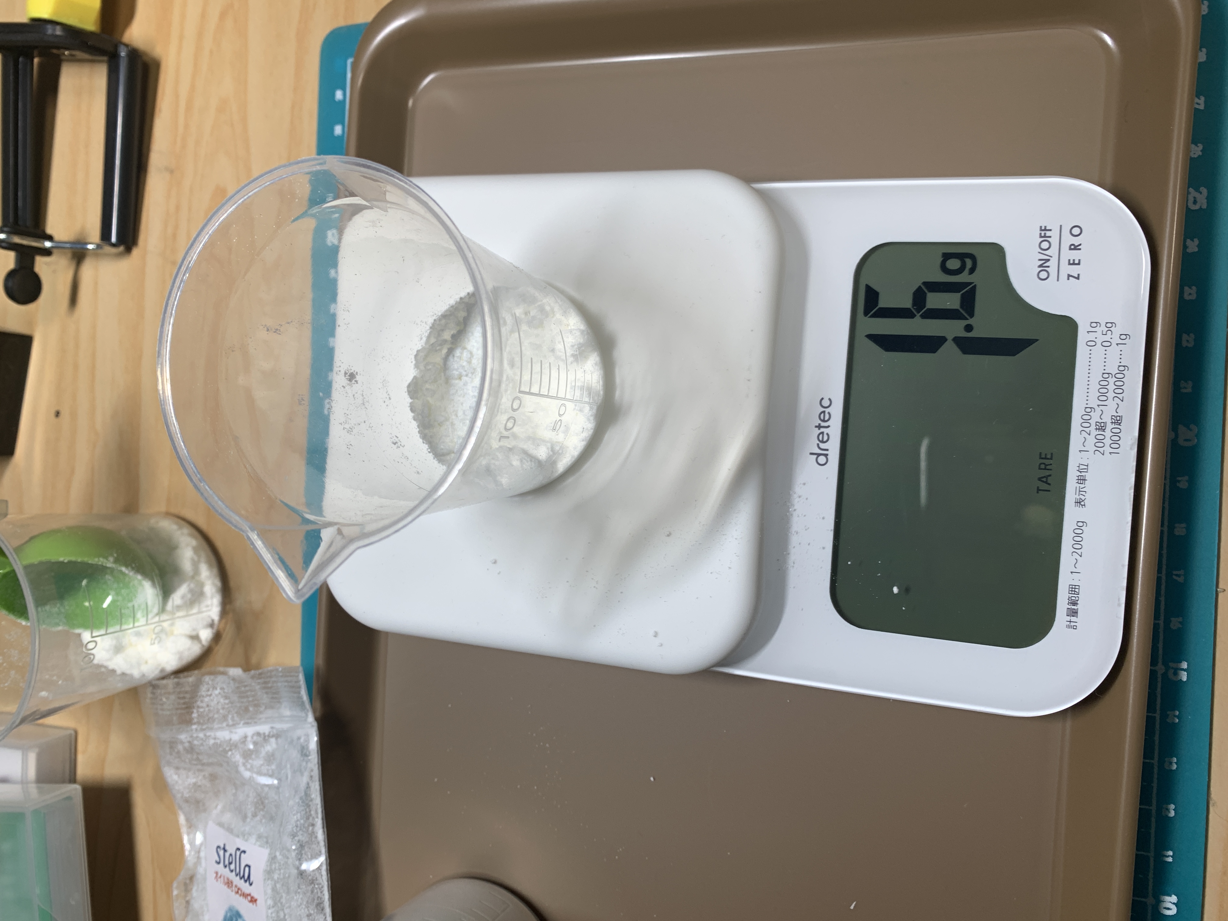 https://ballmaintenance.no-mania.com/Entry/229/ その後、しばらくして Tさまが、送ってくださいました♪ 頂いてから、少し時間が経ちましが 本日、簡単に調査いたしました まずは用意したもの 計量カップ 2個 (風袋用に別途1個) 計量スプーン 大さじ 計量スプーン 小さじ 印象は、大きさの割に軽い 20g 1400円 POPはついてこないみたいなんで画像だけ まずは重さから測ってみます 23.1グラム 袋あるんでそんなもんでしょ 計量カップに出してみた 20.7グラム キッチリ入ってますね 説明書の通り 大さじ1杯(すりきり)取って もう1個の計量カップに入れてみる 4.2gです 説明書では、2グラムとなってるので 大さじだと多すぎますね 小さじでやってみよう すりきり1杯だと 1.6グラム 小さじ大盛り1杯ならば 2.7グラム 結果として 小さじに中盛りくらいが丁度良いかもですね 水分量が多いのか わりと べたつく感じで スプーンにへばりつく 次は、溶解テスト 左 お湯40度を入れた攪拌したもの 右 水を入れて攪拌したもの 水だと ちょっと溶けにくい感じを受けました 泡立ちも良くない リトマス試験紙でのテスト ほぼ中性 粉の付いた指で触ったとこだけ若干青い 粉は若干アルカリ性なんでしょうね オイルを用意しました 10滴入れて攪拌します 左 お湯に溶かしたもの オイルなし 右 お湯に溶かしたものに、オイルを10滴 よく攪拌すると 白濁して泡が消えてゆき 泡立って行かなくなります 以上のことから 界面活性剤がメインの粉せっけんみたいな感じを受けました オイルも乳化できてるし それなりの効果はあると思います 水で良いと書いてますが お湯の方が良い結果になると思いますので お湯推奨です Tさん 提供ありがとうございました 〆 |