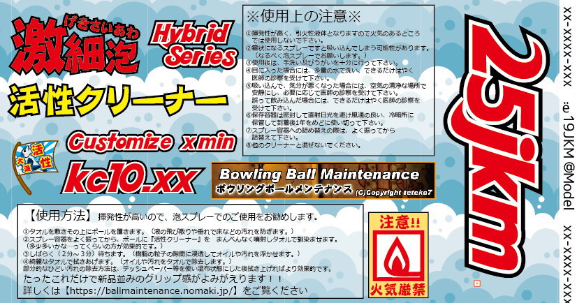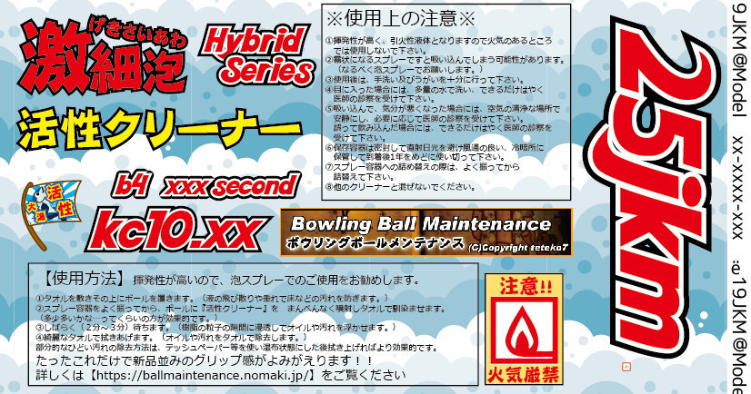ホームページへの詳細は後日追記します ○┓ 泡時間が30秒・60秒・120秒・180秒・240秒の5種類 泡時間が希望時間の1種類 合計6種類から選択して頂けます 泡時間は設定時間となりますので 気温、使用ボールのカバーストック、オイル吸着度合い 表面粗さ、表面仕上げの関係で 実際に泡が消える時間とは異なります 販売金額はKC9と同じにします 25JKMは少し手間がかかりますが ファンの皆様の笑顔のために頑張ります♪ Yahooショッピング 販売ページ 2025年2月24日より1部の商品のみ先行販売してます 4月初旬よりフルラインナップで販売させていただきます (3月11日準備が出来ましたので販売スタートしました) 3種セット https://store.shopping.yahoo.co.jp/7neko/trial3.html 500cc https://store.shopping.yahoo.co.jp/7neko/kc10-500.html 2リットル https://store.shopping.yahoo.co.jp/7neko/kc10-2.html お好きなクリーナー全種 https://store.shopping.yahoo.co.jp/7neko/18bcfec7af.html 23年24年に頂いた23JKMのフィードバックをまとめたもの KC10.x 23JKMになって、泡時間が数秒伸びたがKC9.0xとの違いが解りずらい 泡時間が、10秒程度なのでしばらく置いておくことができなく すぐ拭かないと液が垂れてしまう パワフルで、オイルと汚れがしっかり落ちますが オイルカット君も併用してるのでもう少しマイルドな方が使いやすい 溶剤のニオイをもう少し減らしてほしいです 手荒れなどの心配がなく使いやすいです 泡泡に、カスタマイズしたら丁度良くなりました オイルカット君を前後で吹きかけると、さらにキュキュ感が向上します オイルカット君を活性クリーナーの前後で使う方が増えてきまして 足し算じゃなく掛け算になり相乗効果がかなり出ているようです 今回KC9.0x(泡時間6秒)との差別化のため 泡時間を大幅に伸ばしたモデルを併売することにしました 水路の鍵を開くオイルカット君OC1.47 オールマイティなKC9.0x 激細泡でマイルドなKC10.xx 25JKM 【KC10.xx 25JKM 基本スペック】 〇泡維持時間 30~240秒に設定(温度や使用するボールにより変動あり) (泡時間のカスタマイズも可能ですので注文時に指定して頂けます) 〇微細分化した高品質のアニオン系界面活性を使用してるので 分解したオイルと汚れが細かいので除去しやすい 〇余計な香りをプラスしてないのでボールのフレグランスの邪魔をしない 〇前回同様、界面活性剤を従来より小さくしたものを採用してます ナノレベルでオイルや汚れのごくわずかな隙間へ浸透し オイルと汚れの除去率を向上させています。 【KC10.x 23JKMからの変更点】 〇鍵を開けるパワーも持ちつつ泡時間を大幅にプラスしました 泡の維持時間 9秒⇒180秒に設定してあります。 オイルやカバーストックに触れても泡が消えないのが特徴で 激細泡をしっかりボールに馴染ませ丁寧にクリーングするのが目的です。 (お客さまのクリーニングスタイルに合わせて泡時間をカスタマイズ可能) 〇界面活性剤(jkm)の m成分と jk成分の配合割合を変更し 泡時間を向上させました。 〇クリーニングの物足りなさを感じないようにもちもちな激細泡にしてます 〇オイルカット君との併用時の洗浄バランスが良くなるように調整しました <<プロセス>> 活性クリーナー バージョン10 25年モデル ラッキーストライク量産クリーナーを作ろう コイン100で★をどれだけ集めれるかチャレンジ中♪ 〆 |