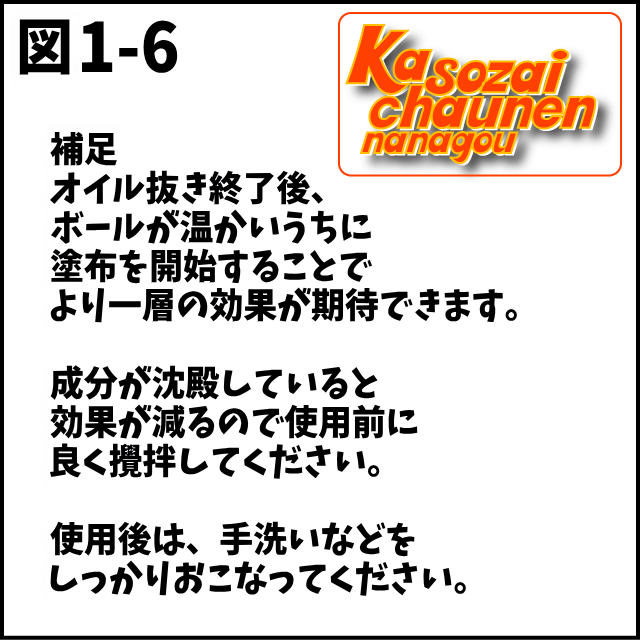 補足 オイル抜き終了後、ボールが温かいうちに 塗布を開始することでより一層の効果が期待できます。 成分が沈殿していると効果が減るので