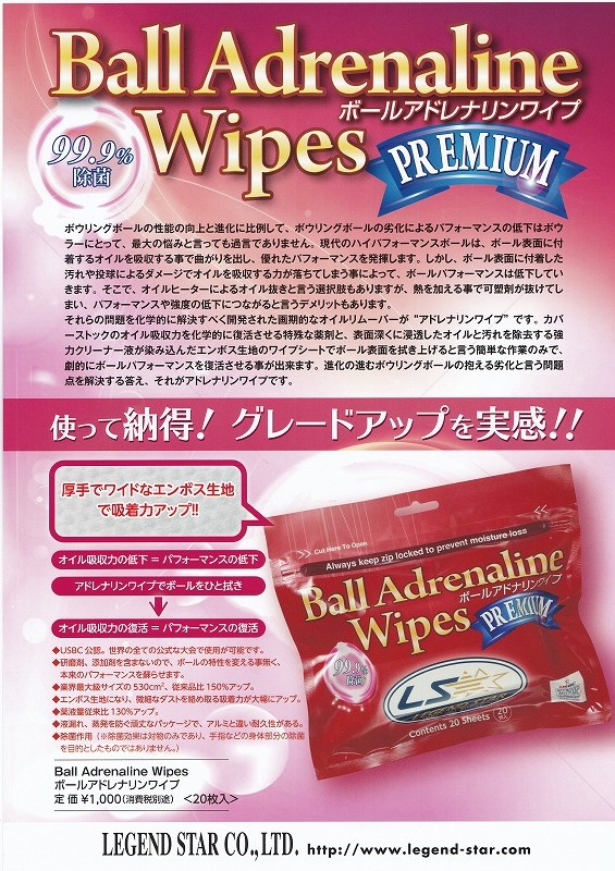 それらの問題を科学的に解決すべく開発された画期的なオイルリムーバーが“アドレナリンワイププレミアム”です。カバーストックのオイル吸収力を科学的に復活させる特殊な薬剤と、表面深くに浸透したオイルと汚れを除去する強力クリーナー液が染み込んだエンボス生地のワイプシートでボール表面を拭き上げると言う簡単な作業のみで、劇的にボールパフォーマンスを復活させる事が出来ます。進化の進むボウリングボールの抱える劣化と言う問題点を解決する答え、それが“アドレナリンワイププレミアム”です。