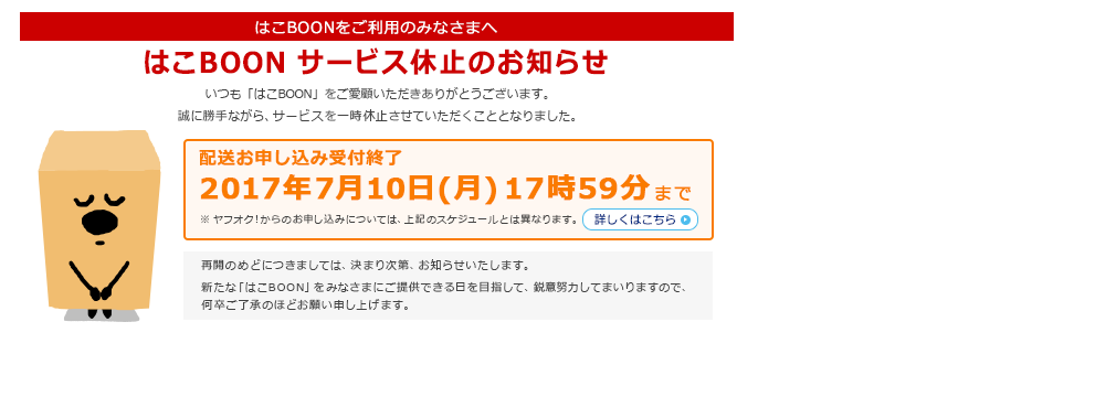 2017年7月10日に「はこBOON」の配送申し込みが終了